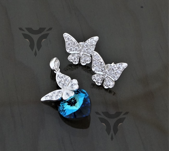 Arete y dije mariposa de zirconia con corazon swarovky
