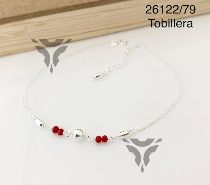 Tobillera bolita facetada y cristales rojos