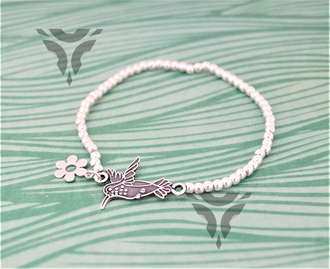 Pulsera de bolitas con colibri y flor